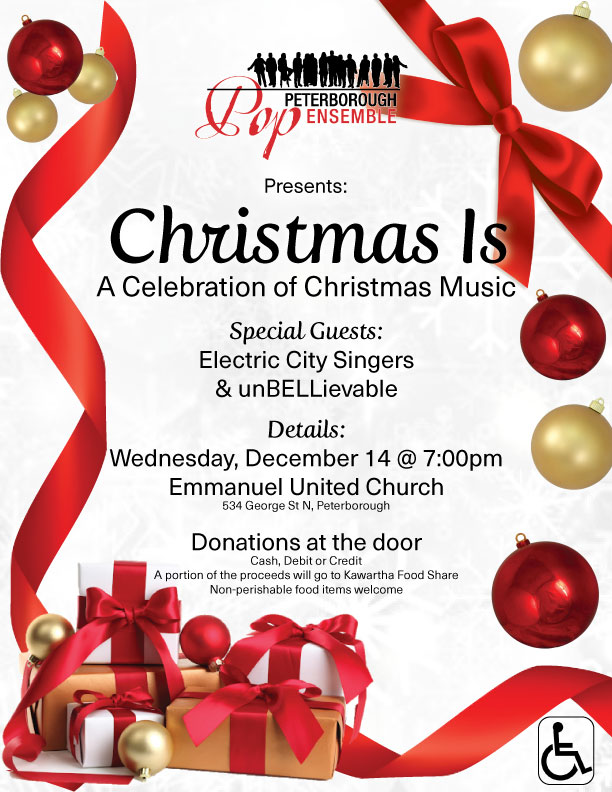 On Wednesday, December 14, 2022 the Peterborough Pop Ensemble will be presenting Christmas Is at Emmanuel United Church; a celebration of the season including some of the Ensemble’s favourite Christmas music and some sing-along Christmas standards to get everyone involved.