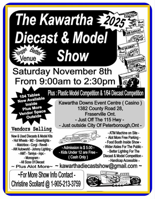 Kawartha Diecast & Model Show Where Kawartha Downs Event Centre, 1382 County Road 28, Fraserville, Ontario Map When Nov 08/25 09:00 AM - Nov 08/25 02:30 PM Age All Price Starting at $5.00 (kids under 12 free) Website https://www.facebook.com/profile.php?id=100089204244983