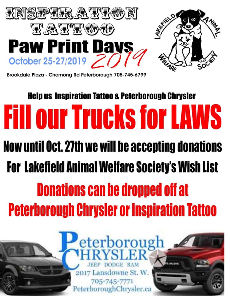 Inspiration Tattoo’s fundraiser for LAWS, PAW PRINT DAYS 2019, is this weekend— October 25th-27th! On top of this exciting event, Inspiration Tattoo and Peterborough Chrysler are collecting donations for us for their FILL OUR TRUCKS FOR LAWS event until Sunday, October 27th.